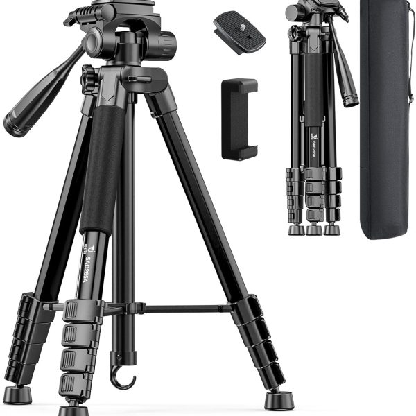 73" Camera Tripod Stand, Aluminum with Phone Holder, Travel Bag, Black