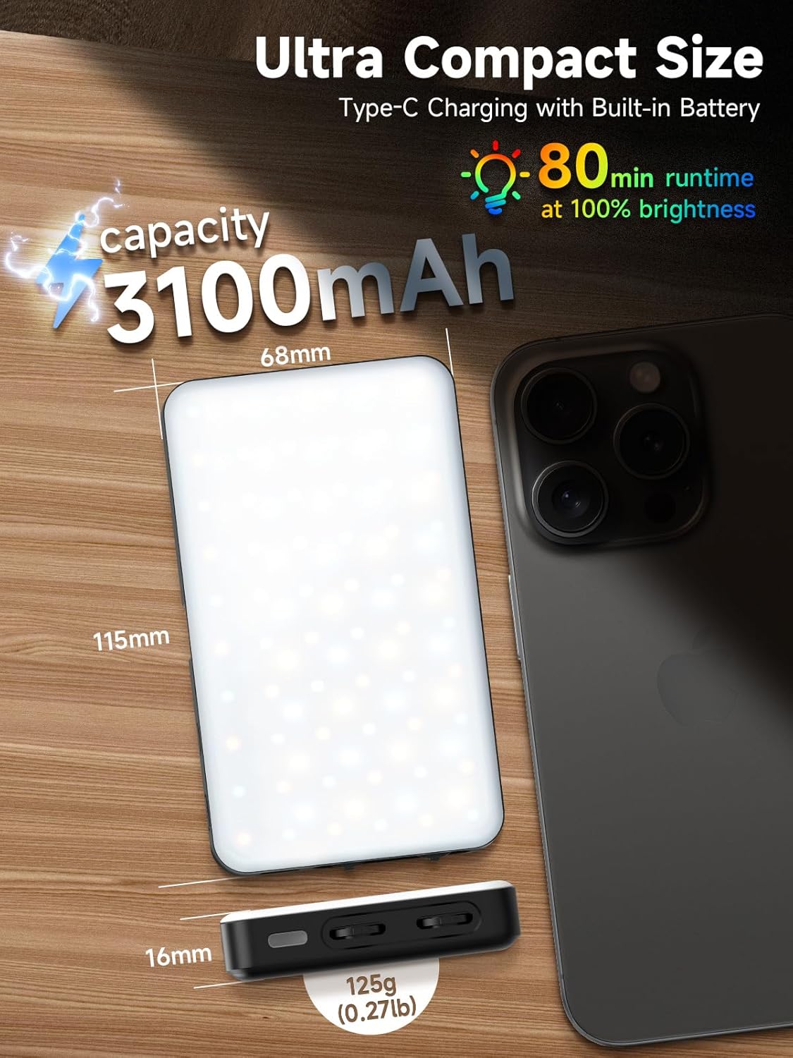 - 【Portable & Durable Photography Lights】 Lightweight and compact (125g), portable light for photography supports maximum output 5V 2A to power other devices (cables excluded). 3100mAh large battery capacity empowers the light with about 2H at 100% brightness.