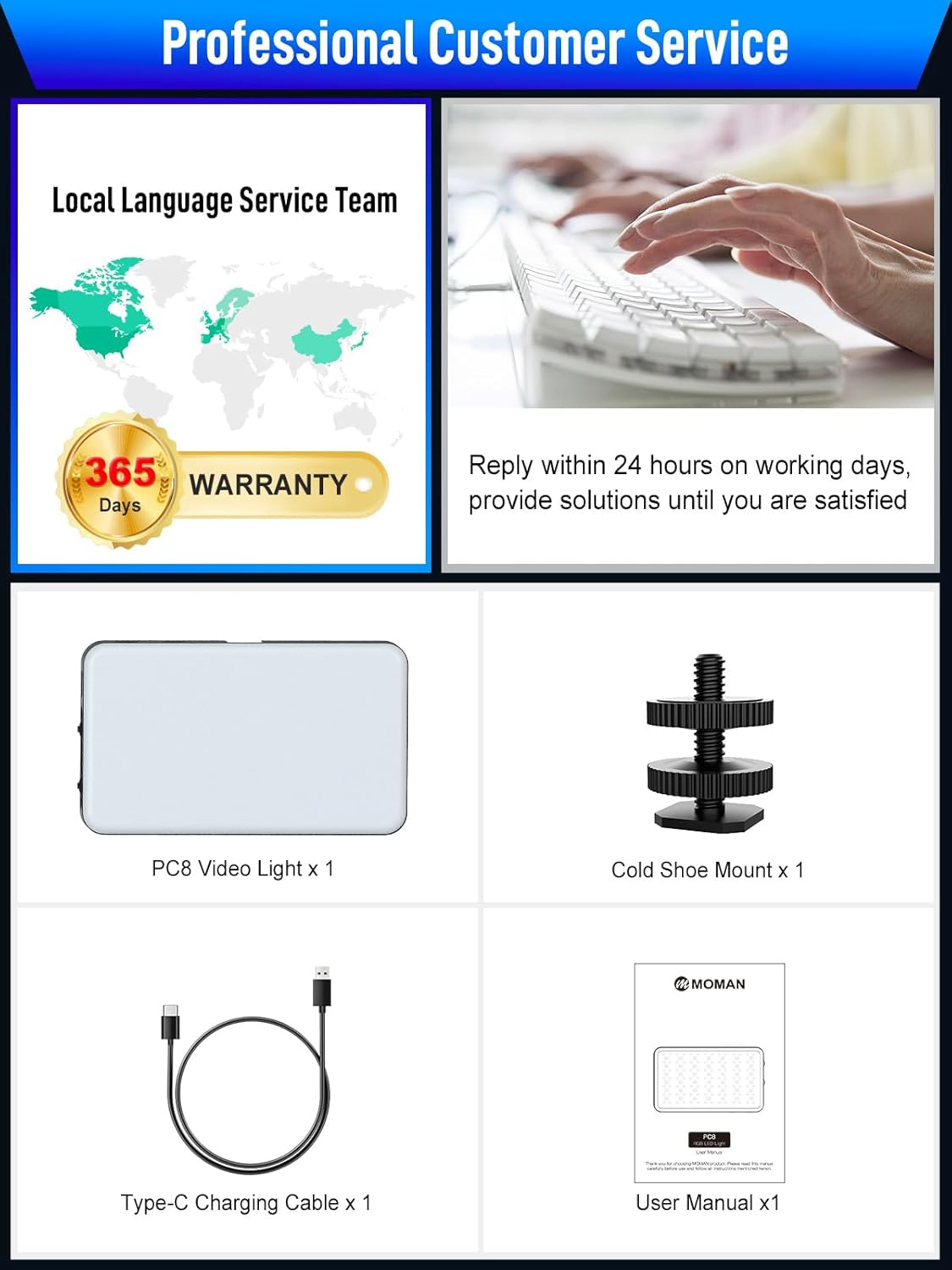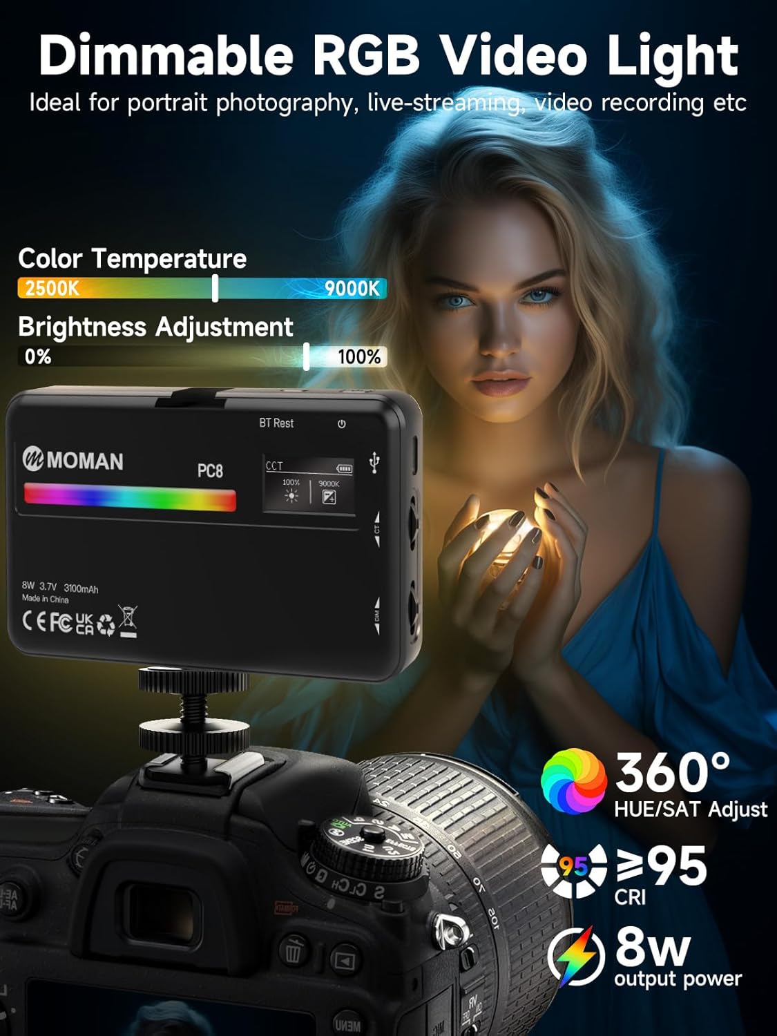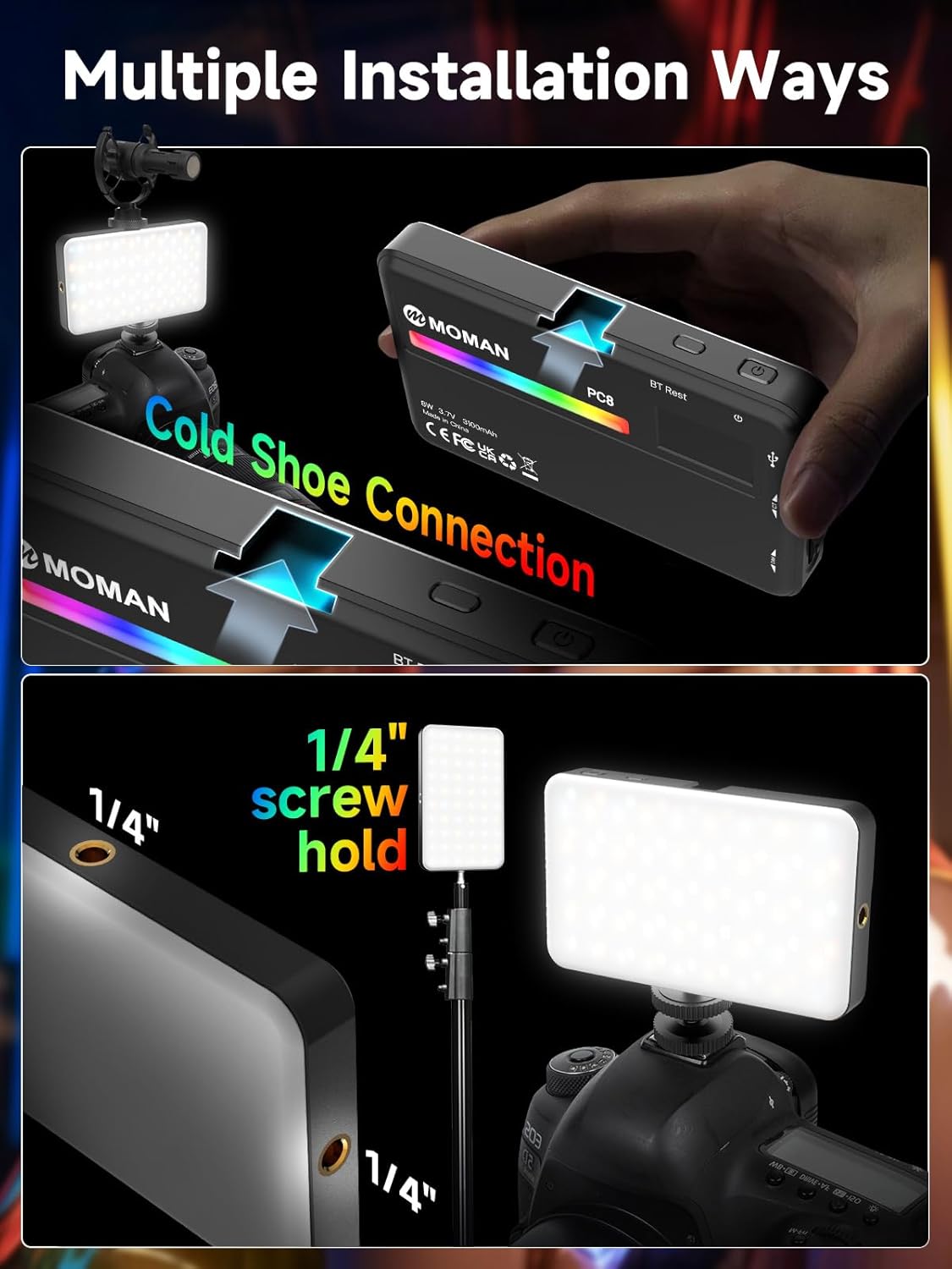- 【3100mAh Rechargeable Battery】: The Moman RGB video light is built-in 3100mAh rechargeable lithium battery, Full brightness output up to 2 hours, min brightness output up to 15 hours. With Type-C charging port on-camera video lights, they also can be used while charging.