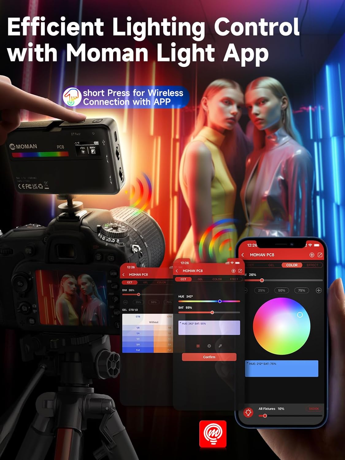 Moman LED Camera Light, RGB Video Lights for Photography, App Wireless PC8