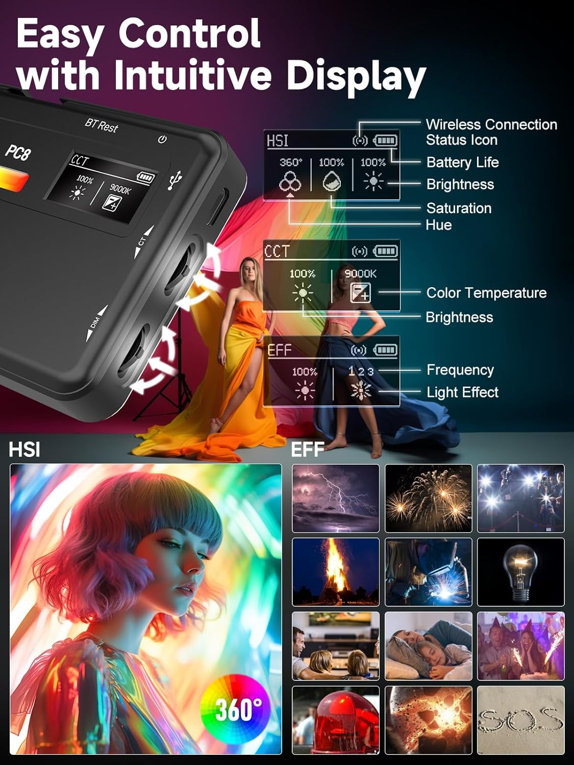 - 【13 Built-in Lighting Effect】The light for camera adopts 91pcs high color rendering index lamp bead. Inbuilt with 13 lighting effects including Fire, CCT chase, TV, Explosion, Faulty Bulb, Welding, Strobe, Lightning, and SOS, MOMAN LED video light offers a variety of changing cinematic scenarios. For all your needs in different situations