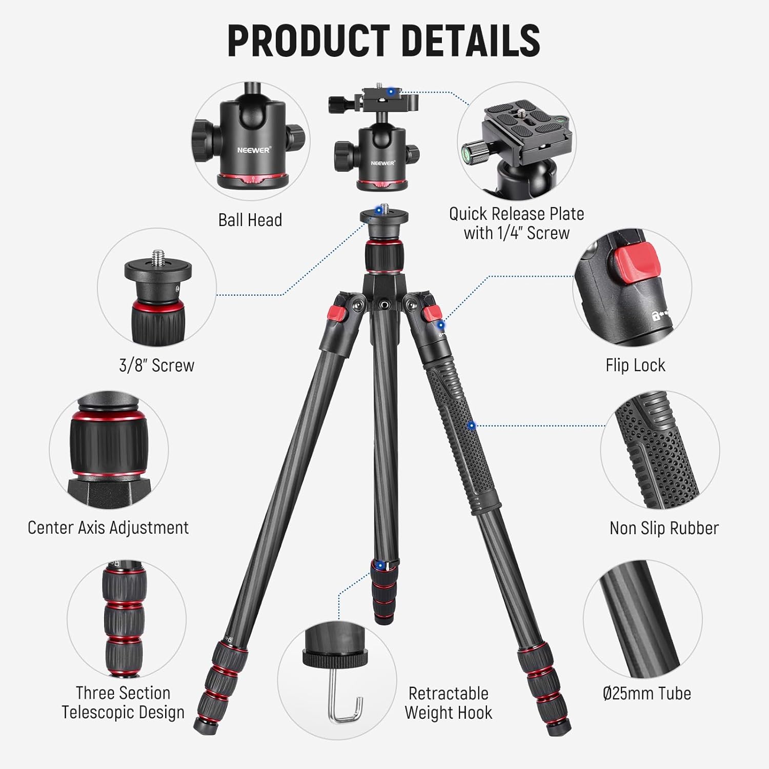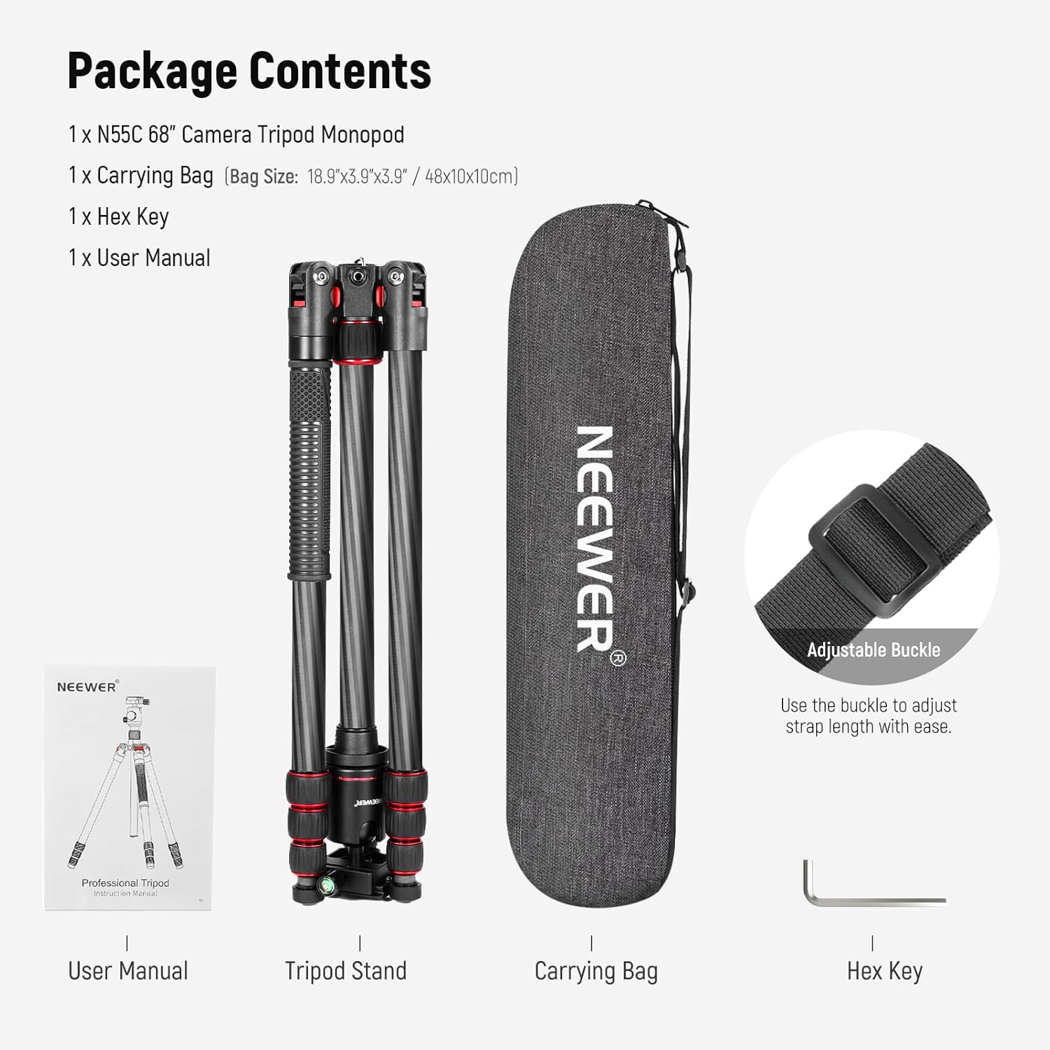 NEEWER 66″/168cm Carbon Fiber Tripod for Camera with 360° Panorama Ball Black