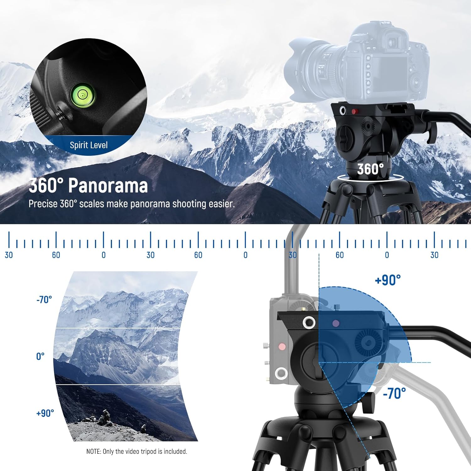 - 【Damped Fluid Head】 Capturing high quality videos using this fluid head, providing 360° pan and -70°/+90° tilt for versatile shooting angles, and smooth and controlled movements. Also includes a bubble level for quick, accurate horizontal alignment, and a detachable handle for a different dominant hand