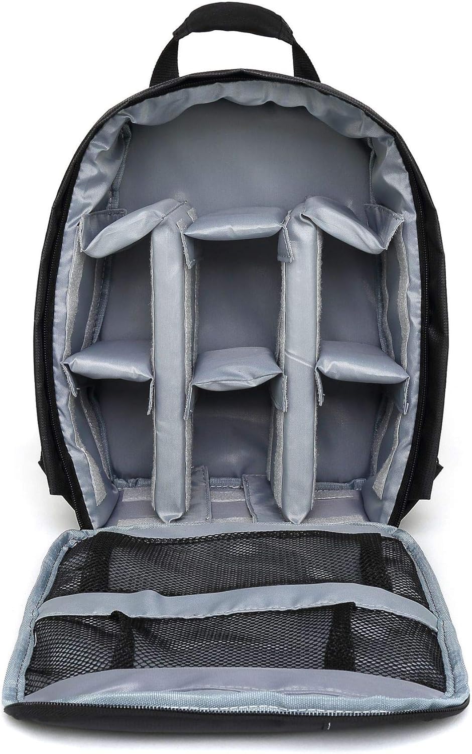 Camera Bag Camera Backpack with Rain Cover for DSLR Cameras , Lens, Tripod and AccessoriesMade from durable weather resistant nylon with tough reinforced stitching for everyday carry.Adjustable padded dividers make it easy to customize your current gear. Compatible with Canon, Nikon, Sony, Olympus, Pentax and other DSLRs and photographic equipment.Customize It : No matter what equipment you use, the removable interior of the backpack can be adjusted to fit multiple DSLR bodies, lenses, and accessories. The bag also features adjustable straps on the exterior to attach and carry a tripod.Abrasion resistant : Made of high density durable nylon, waterproof and durable, all weather cover, easy clean and wash. At room temperature, It’s can be bend up to 20 million times with no crack left.Product Specifications:Material: 900D 100% Waterproof NylonColor:Grey & BlackProduct Dimensions:8.2″x12.5″x5.1″Product Weight : 15.16oz
