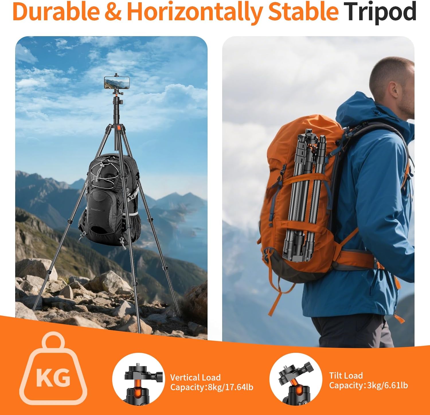 - 【Multiple Shooting Angles】With 360°panoramic ball head mount, the camera tripod supports 360° rotation shooting in the horizontal and vertical planes which creates various angles and heights for you to pick up while taking panoramic photos/videos/live-streaming. [Max load 8kg/17.64lb (vertical) or 3kg/6.61lb(45° tilt)]